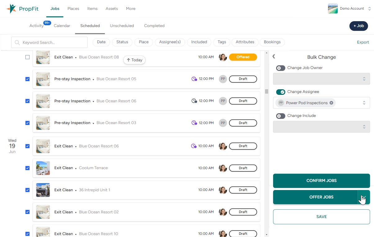 PropFit’s templates, bulk actions, automations, repeating jobs and drag‑and‑drop rescheduling makes it a breeze tocoordinate who does what and when.